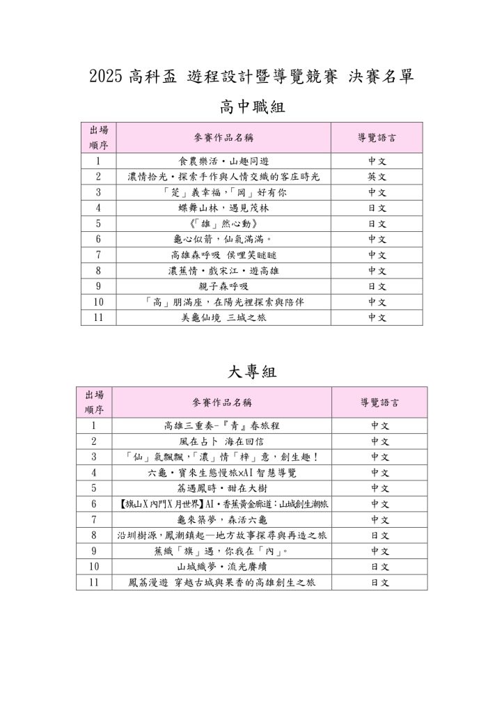 2025高科盃 遊程設計暨導覽競賽 決賽名單公告