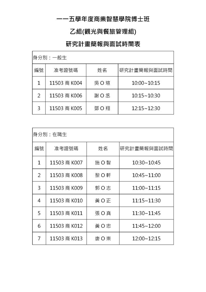 ☆115學年度商業智慧學院觀光組博士班招生入學面試時間表
